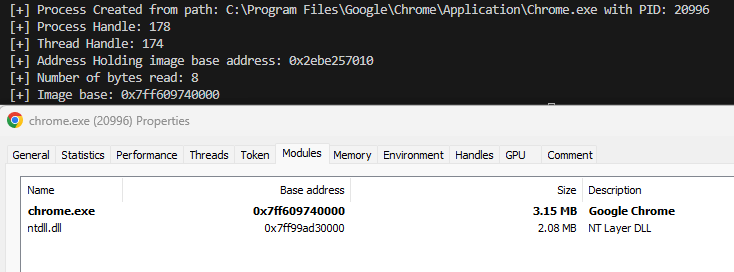 A quick look in process hacker shows that the base address of the target Process is indeed the one returned by our code.